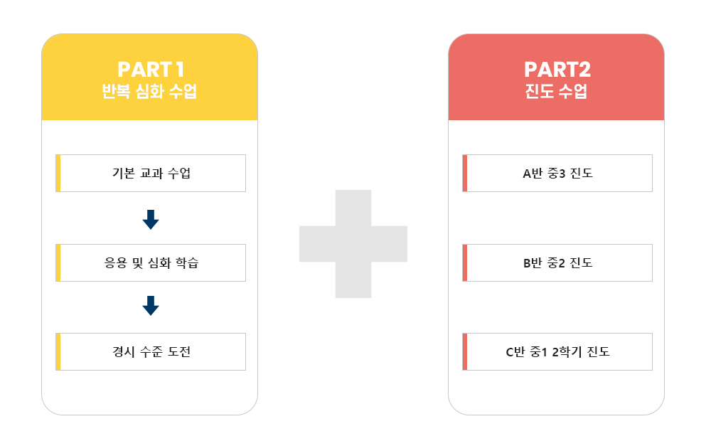 ※ 모든 수학반은 수준별 반 구성을 통한 반복심화 + 진도수업 5:5 비율의 수업을 진행합니다.