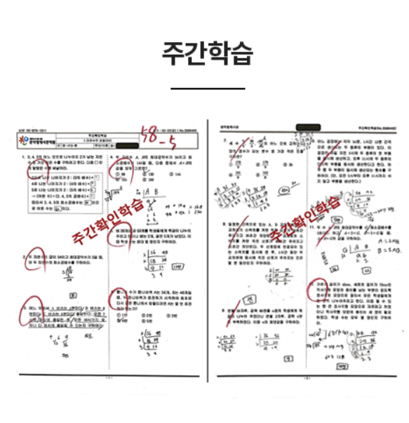 (한)주에 한번 주간확인학습 (두)달에 한번씩 수학경시 (세)달에 한번씩 성취도평가 |